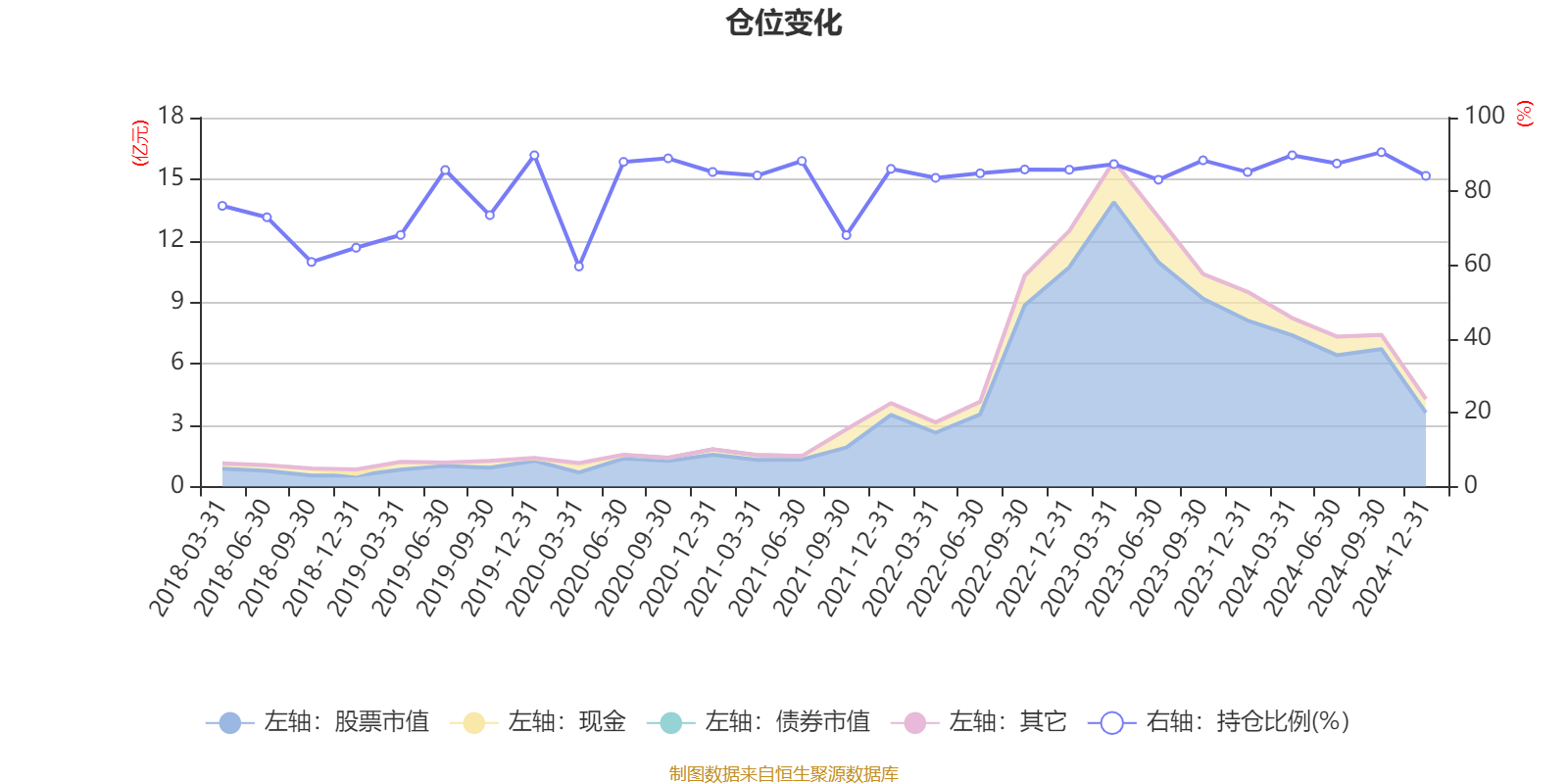 据定期报告数据统计,近三年平均股票仓位为86.4%,同类平均为85.73%。2024年三季度末基金达到90.61%的最高仓位,2020年一季度末最低,为59.65%。